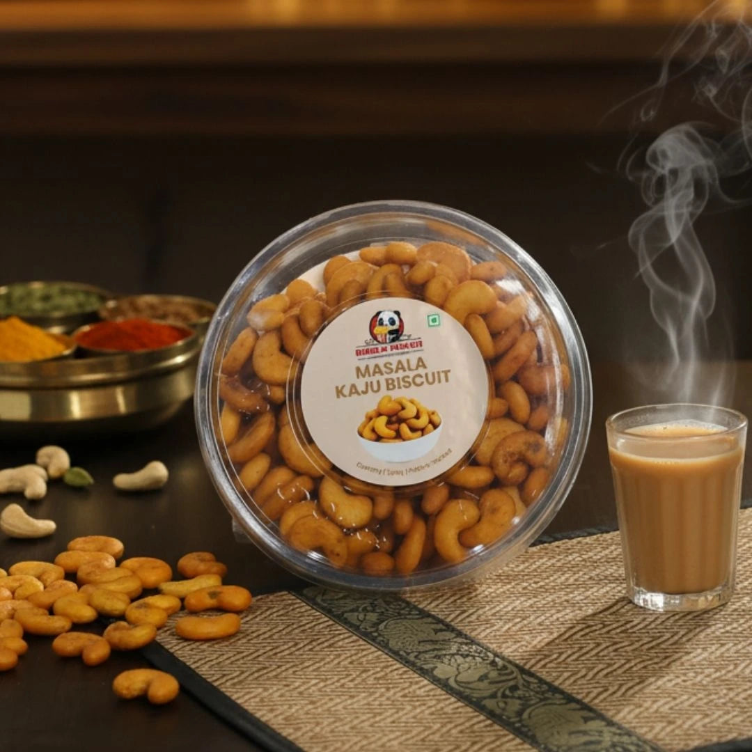 Masala Kaju Biscuits The Savory Twist to Tea-Time n n n nUnique Flavor Crunchy biscuits shaped like cashews, spiced with Indian masalas. n n nSavory Indulgence A perfect alternative for those who prefer salty over sweet. n n nTea-Time Essential Pairs deliciously with chai or evening snacks. n n nCrispy & Tempting Light, crunchy, and packed with zesty flavors. n n