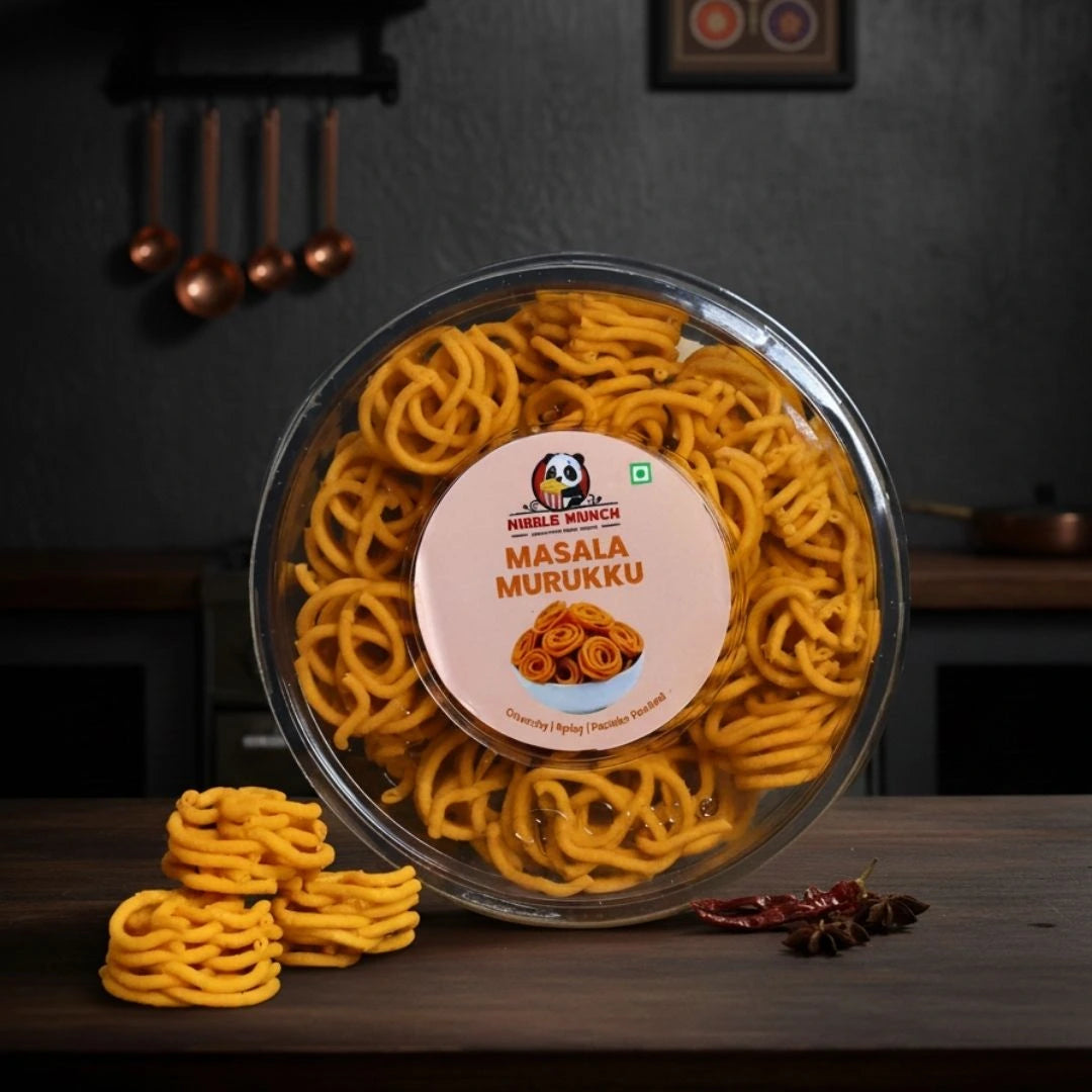 Masala Murukku South Indian Crunch with a Spicy Twist! n n nTraditional Snack, Upgraded Classic Murukku spirals get a flavorful masala makeover. n n nInfused with Authentic Spices Blended with a special mix of South Indian spices for a rich, aromatic taste. n n nPerfectly Crispy & Crunchy Each spiral delivers an irresistible bite thats hard to stop at just one. n n nSavory Indulgence A tasty, spiced snack that pairs perfectly with tea, coffee, or festive celebrations. n n