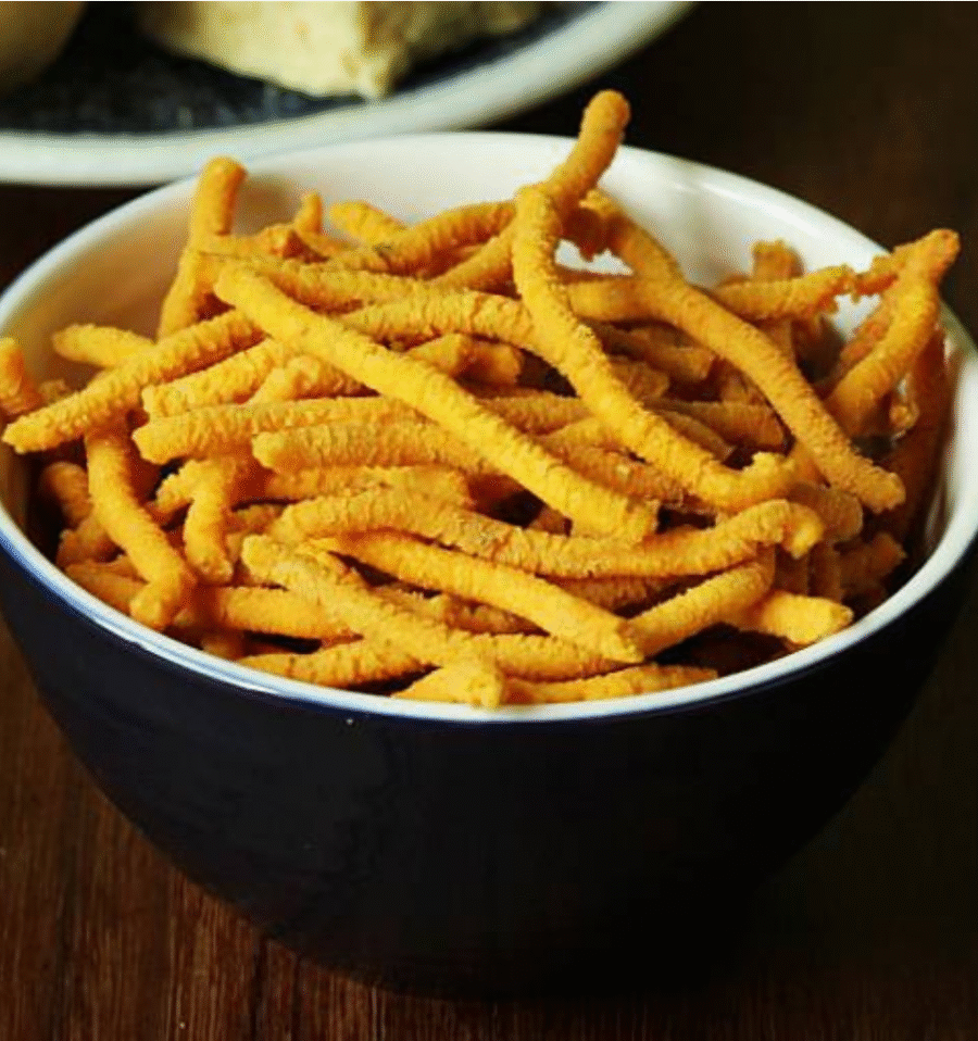 Kara Sev is a hot and spicy fried noodle-shaped snack made from besan and ajwain (carom seeds). It’s bold in flavor and great to munch on during movie nights or tea time.